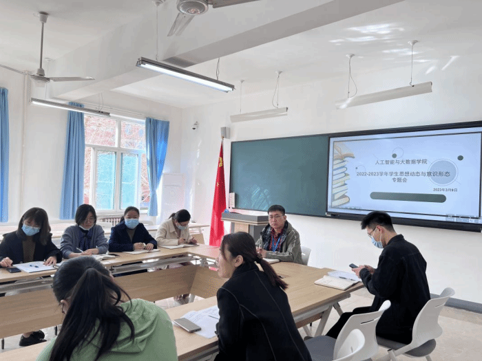 为深入学习贯彻习近平新时代中国特色社会主义思想,落实全国教育大会、高校思想政治工作会议精神,全面客观掌握新学期我院学生思想动态,增强新学期学生思想政治教育和管理的针对性、实效性。3月9日下午,人工智能与大数据学院在启行楼216会议室举行2022-2023学年学生思想动态与意识形态专题会。人工智能与大数据学院党总支书记兼学管副院长尹钧、学管办主任杨家腾、团总支书记王珊、招生就业办公室主任孟鑫、各教研室主任以及全体辅导员参加了此次会议,会议由学院党总支书记兼学管副院长尹钧主持。