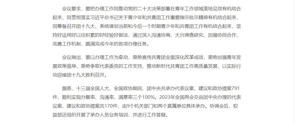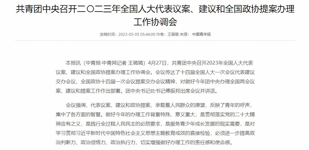 简介:共青团中央召开2023年全国人大代表议案、建议和全国政协提案办理工作协调会。会议传达了十四届全国人大一次会议代表建议交办会议、全国政协十四届一次会议提案交办会议精神,对做好今年团中央办理全国两会议案、建议和提案工作作出部署。团中央书记处书记傅振邦出席会议并讲话。