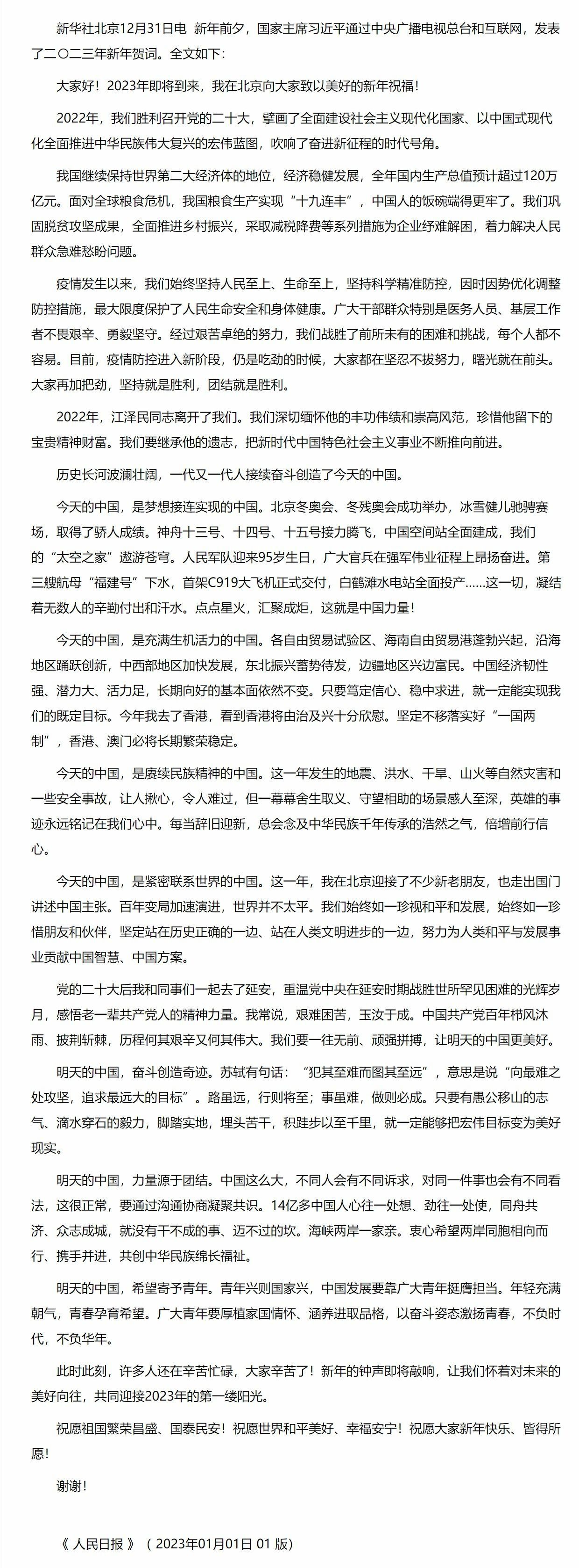 国家主席习近平发表二〇二三年新年贺词