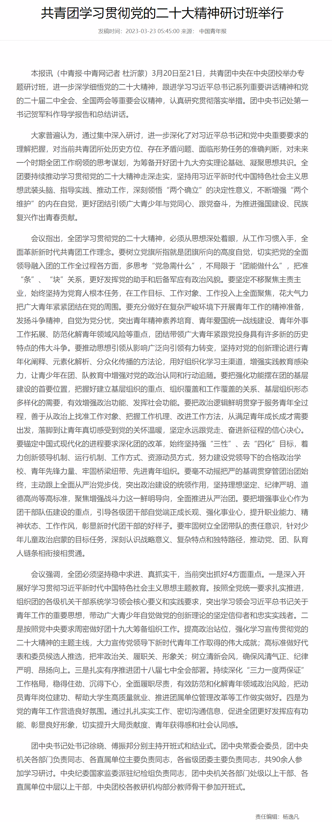 简介:本报讯(中青报·中青网记者 杜沂蒙)3月20日至21日,共青团中央在中央团校举办专题研讨班,进一步深学细悟党的二十大精神,跟进学习习近平总书记系列重要讲话精神和党的二十届二中全会、全国两会等重要会议精神,认真研究贯彻落实举措。团中央书记处第一书记贺军科作导学报告和总结讲话。