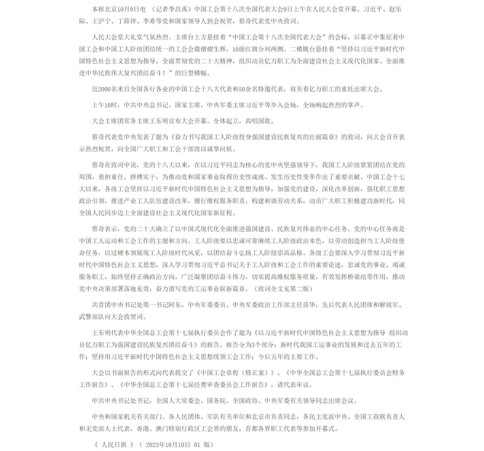 10月9日,中国工会第十八次全国代表大会在北京人民大会堂开幕。