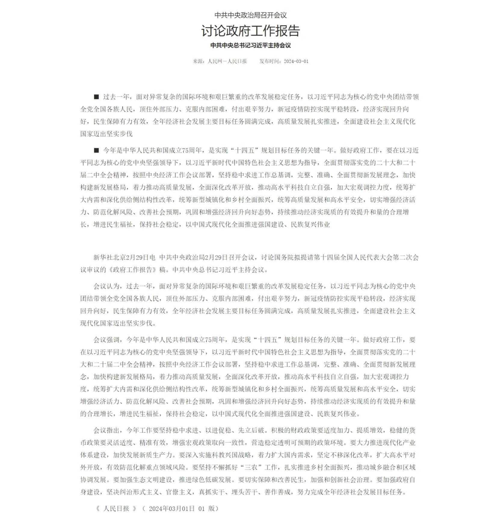 新华社北京2月29日电 中共中央政治局2月29日召开会议,讨论国务院拟提请第十四届全国人民代表大会第二次会议审议的《政府工作报告》稿。中共中央总书记习近平主持会议。
