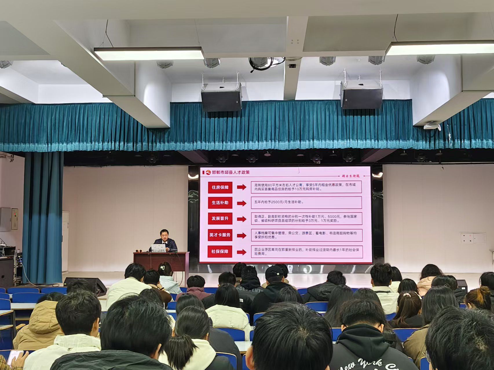 宣讲会伊始,邯郸市邱县人社局高军先生发表了充满热情的致辞,并向在座的各位学生表达了诚挚的问候。紧接着,他详细介绍了邯郸市近年来在经济、文化、科技等领域的飞速发展,以及对各类专业人才的迫切需求,对各类人才的优待。他强调,邯郸作为历史文化名城,正处于转型发展的关键时期,市政府出台了一系列优惠政策,对本科生以上学历均享有住房保障及生活补贴、对硕士研究生以上学历均享有英才卡服务、发展晋升、环保保障,为来邯人才提供广阔的发展空间、优厚的福利待遇和良好的生活环境。介绍了邯郸市人才一体化服务平台(线上服务) 以及邯郸市人才大厦(线下服务)。