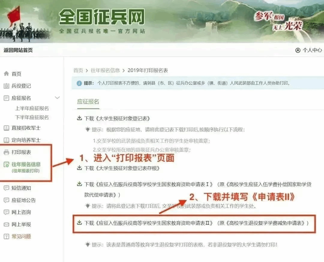 可登录全国征兵网大学生征兵报名系统,进入“打印报表”页面下载《应征入伍服兵役高等学校学生国家教育资助申请表Ⅰ》(一式两份,以下简称《申请表》)并按要求填写相关信息。