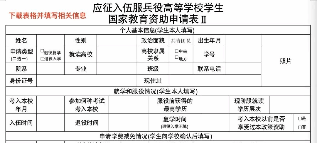 退役后自愿回校复学(入学)的学生,到学校报到后向学校提出学费减免申请,可登录全国征兵网大学生征兵报名系统,进入“打印报表”页面下载并填写《应征入伍服兵役高等学校学生国家教育资助申请表Ⅱ》