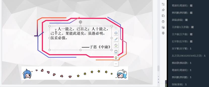 我们选用钉钉进行课程直播教学。师生隔空对话,为保证效果。每天课前查找资料,认真备课,精心制作课件,画面生动、形象,能吸引学生。制作课件,不停反思,改变策略,视频、语音交叉进行。按照课表时间安排提前做好准备开直播上课,课前我们使用学习通进行签到。在这个特殊的假期里,在每天的线上教学中,我们脑海里每天出现最多的三个词是——提前准备、主动交流、融入思政。