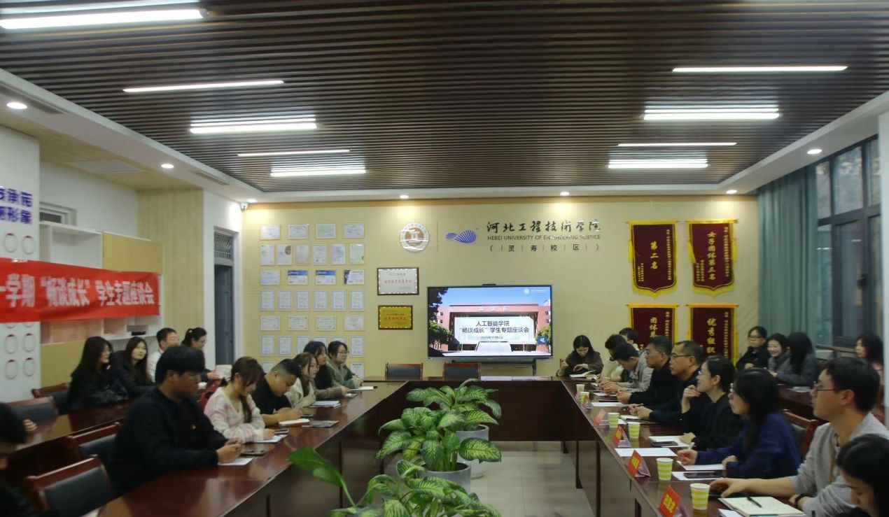 人工智能学院于2025年11月6日在灵寿校区5号教学楼106会议室开展以“畅谈成长”为主题的座谈会。会议聚焦宿舍生活、教学保障、餐饮服务、校园设施等师生关切的核心议题。此次参会人员有人工智能学院党总支书记、学管副院长尹钧,教学副院长林海霞,灵寿校区管理委员会副主任王中凯,灵寿校区管理委员会副主任胡丽莎(企业方),教学秘书田慧龙,以及2024、2025级辅导员和各年级学生代表共30余人参会,通过面对面交流的形式,倾听师生诉求、共商校园服务优化方案。