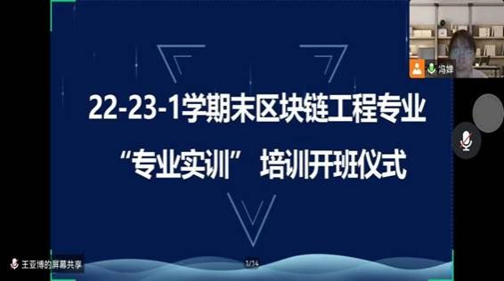 为了增强区块链工程专业学生对专业的理解,使学生们熟悉区块链的技术发展动态,认识区块链的未来趋势,并且在学习中精进和掌握区块链技术。12月19日上午,人工智能与大数据学院邀请远在加拿大的覃文延专家面向区块链工程专业全体学生举行了22-23-1学期末区块链工程专业“专业实训”培训开班仪式。参与人员有人工智能与大数据学院王院长、教学副院长林海霞、学管副院长兼党总支书记尹钧、实训副院长孙劼、区块链工程专业全体教师及学生。本次仪式由人工智能与大数据学院冯婵老师主持。