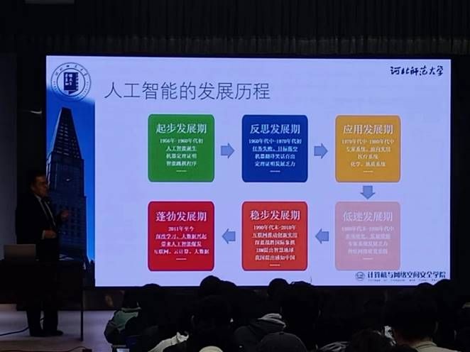 人工智能作为引领新一轮科技革命和产业变革的重要驱动力,推动着各行业、各领域的飞速发展。为了培养专业型人才,增强学生对人工智能学科的了解,提高学生学习积极性,人工智能与大数据学院于2023年3月23日在次教101教室开展了“人工智能展望与融合应用”专题讲座,邀请了河北省优秀科技工作者王威博士主讲,人工智能与大数据学院党总支书记兼学管副院长尹钧主持,人工智能专业、虚拟现实技术专业教师与学生参加。