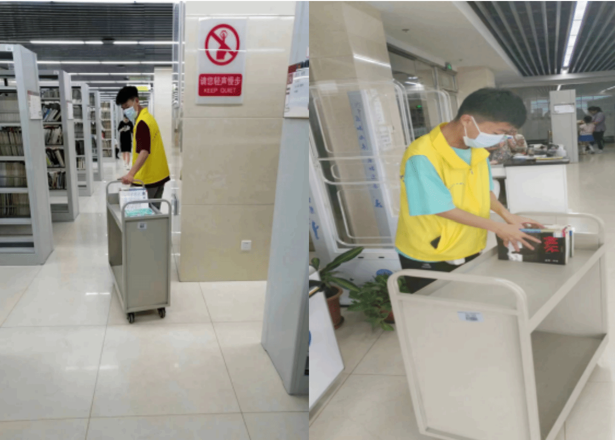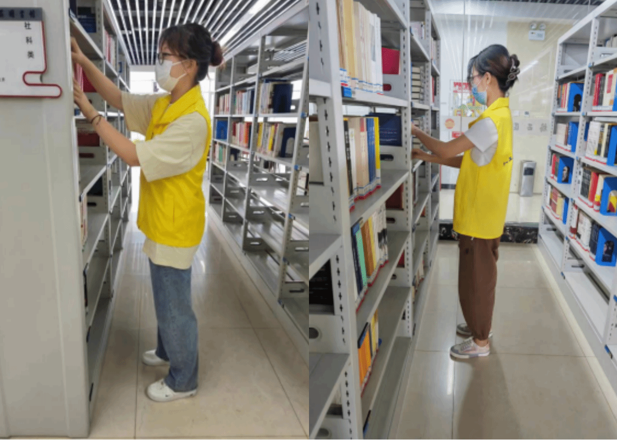 志愿者们在管理员的带领下分工合作,整理图书、清理书架、齐心协力完成工作人员分配的任务。在整理书籍过程中,各阅览区处均有阅读者在自习阅读,志愿者们全程保持安静,动作缓慢轻微,整理后将书籍规范地摆放整理。通过各阅览区的分工协作,志愿者们顺利完成本次活动的整理任务,圆满将图书馆清洁一新。