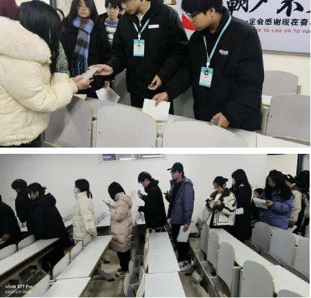 11日晚八点,工作人员全员就位,准备开展工作,大量参赛人员手持参赛作品前来提交签到,现场井然有序,学生们自觉站成一排,等待工作人员查验。