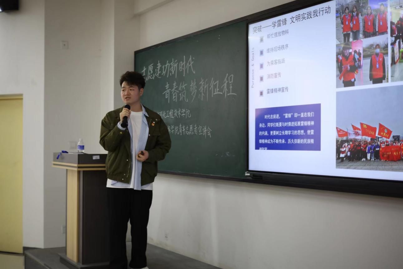 刘彬,曾组织2023年河北工程技术学院消防安全月系列活动,组织学院参加2024年石家庄文明实践我行动雷锋宣传日志愿服务活动;他本人参与过2023中国西部旅游产业博览会志愿服务活动,成渝青年模拟联合国大会志愿服务活动,中国国际智能产业博览会志愿服务活动,IDO动漫游戏嘉年华志愿活动,石家庄轨道交通集团消防救援支队组织的地铁站消防宣传活动等。主持人介绍完毕后,邀请刘彬同学上台进行了“青春当燃,志愿有我”的主题分享。