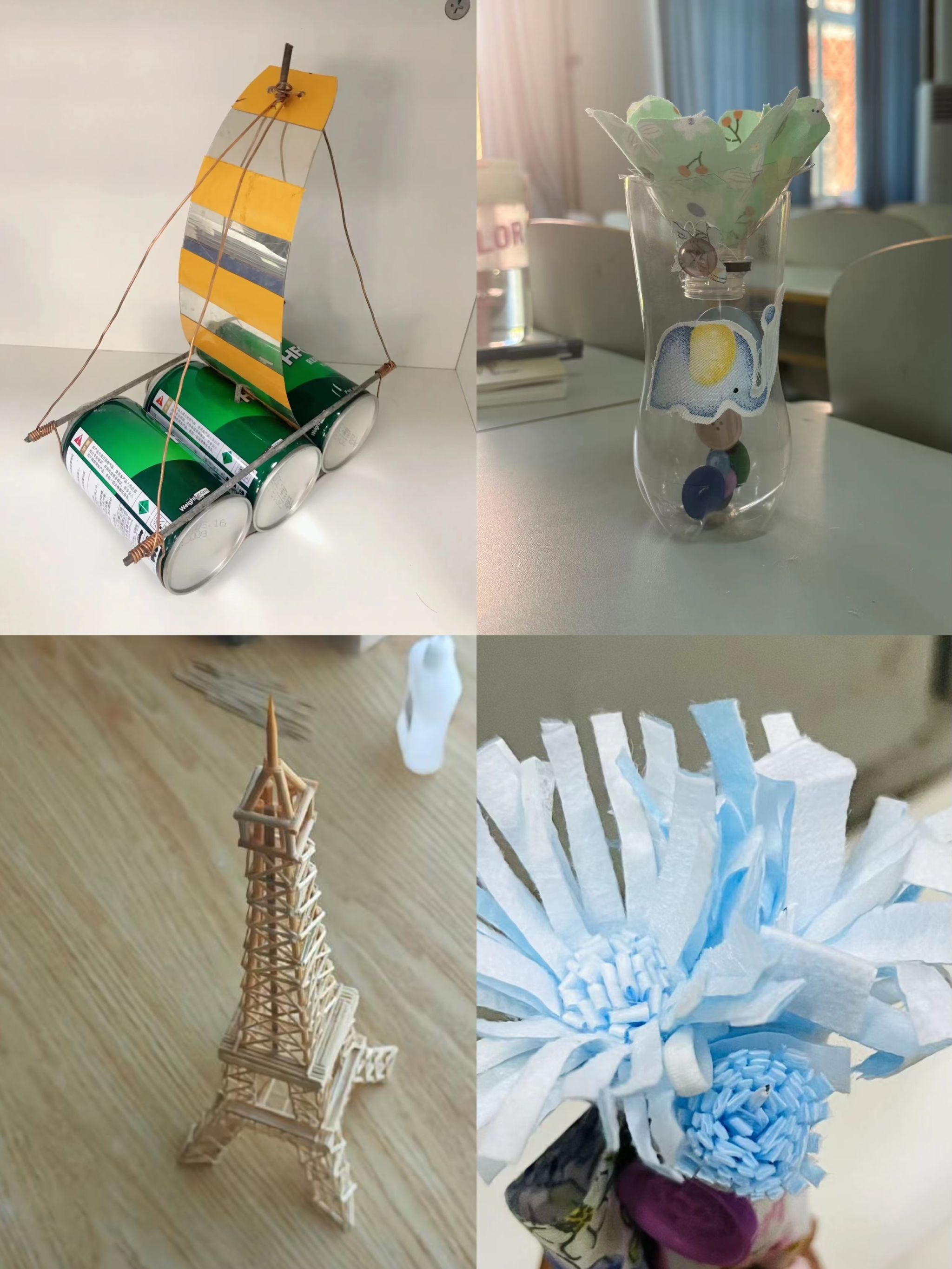 自5月13日开展活动以来,学生们积极参与,收集身边的废弃物,如废纸、废塑料、废布料等,并开始着手设计和制作。在制作过程中,他们充分发挥自己的创造力,用自己的双手完成了一件件绚丽多彩,创意丰富的手工作品。毫不起眼的快递纸盒、平平无奇的A4纸、废旧的矿泉水瓶......在经过同学们的精心裁制、组合、粘贴,变成了一座摩天轮、一个收纳盒、一只小动物等创意作品,惟妙惟肖,形象逼真,充分体现了学生的环保意识和创新能力。