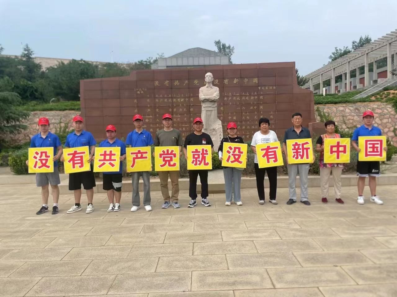 最后,团队“红歌共唱”环节在纪念馆的广场上举行。特别邀请了曹火星纪念馆内的3位管理人员参与了此次别开生面的红歌会,老人们均为当地人,他们热情的向队员们解说《没有共产党就没有新中国》这首歌的历史由来。在合唱过程中,队员们目光坚定,与老人们一起手举歌名牌,心连心,他们的脸上洋溢着对历史的敬畏、对党的深情以及对未来的无限憧憬。他们的歌声,时而低沉而深情,如同在诉说那段艰苦卓绝的岁月;时而高亢而激昂,如同在宣告新时代的到来。