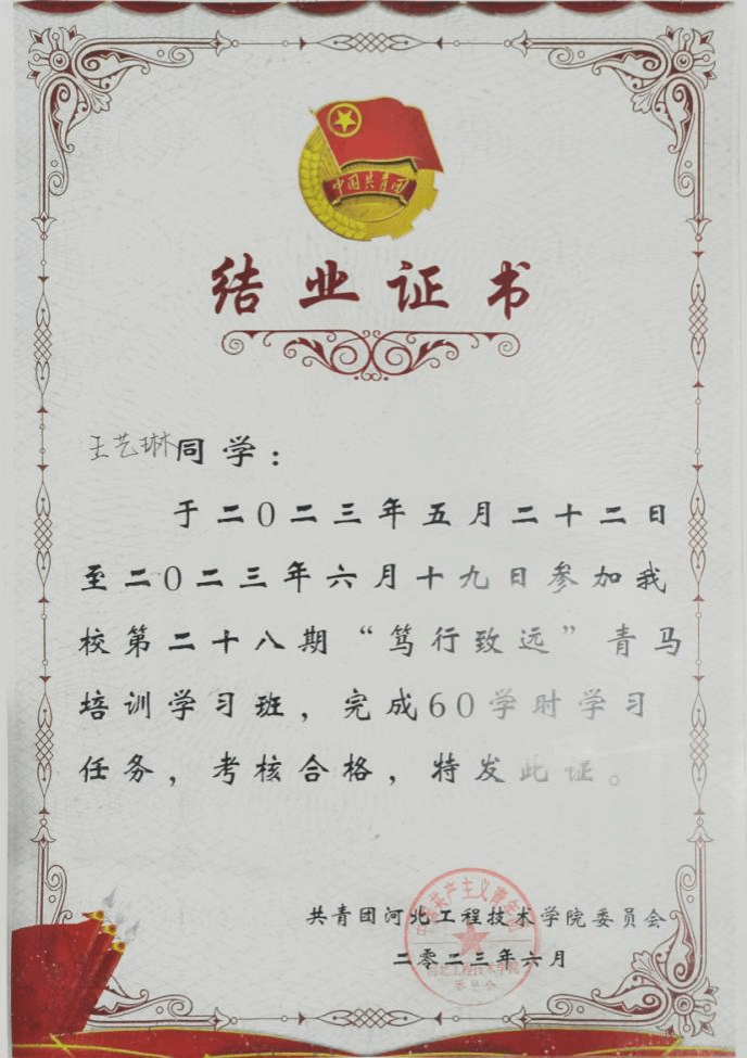 我校第二十八期“笃行致远”青马培训结业证书