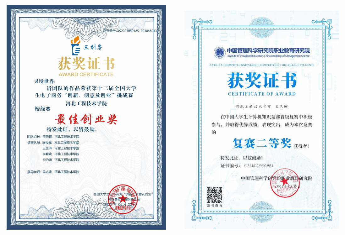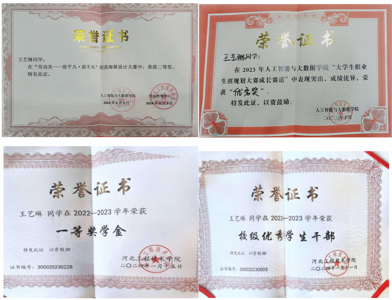 王艺琳,女,共青团员,22级虚拟现实技术二班学生。在大学期间,不仅在学术上取得了优异的成绩,还积极参与社会实践活动,大二曾担任校团委社团管理部副部长职位。在大学这两年获得奖项证书共10项。