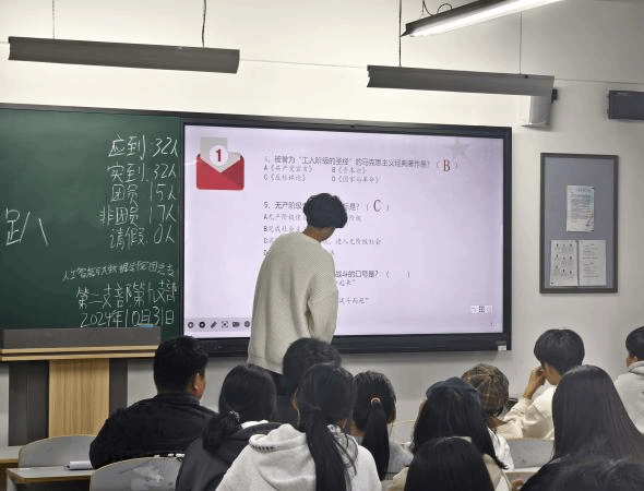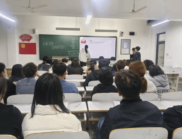 各个支部以知识竞赛的形式为本次活动注入活力。其中,有两个支部相聚于同一间教室,共同开启这场充满挑战与趣味的知识之旅。活动伊始,全体成员起立,激昂的团歌在教室中回荡,每一位同学都精神饱满,展现出对共青团的热爱与敬意。团歌的旋律不仅唱出了青年的朝气,更凝聚了各个支部成员的心。