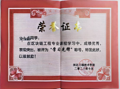 2023年区块链工程专业课程学习中荣获了“学习先锋”称号。
