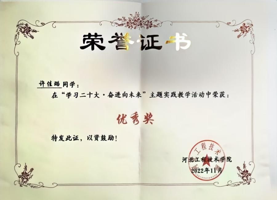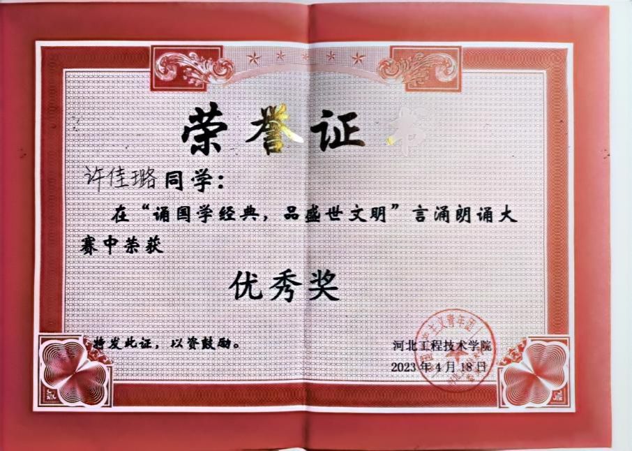 2023年“学习伟人事迹,传承伟人思想”演讲活动中荣获“三等奖”,“三好学生”称号。