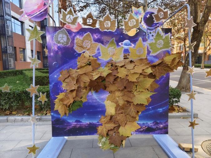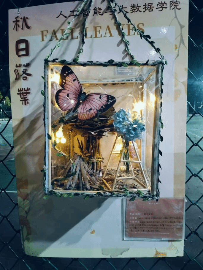学生们发挥无尽创意,对落叶进行精心裁剪,巧妙拼凑制作出一幅幅精美的图案,展板右下标注了设计者的设计理念及作品名称。用落叶制作的花篮,散发着浓郁的田园气息与古朴韵味;发光的蝴蝶灯笼,宛如一群闪耀着奇异光芒的精灵在夜色中翩翩起舞;落叶版蒙娜丽莎,一片片耐心地拼凑出她那神秘而迷人的面容、优雅的身姿散发着古典艺术的庄重与深沉;一个福字传达出对幸福生活的向往、对美好未来的期盼;古风落叶琵琶的造型,仿佛能听到悠扬的古乐从历史的深处传来,令人沉醉在那源远流长的文化长河之中……