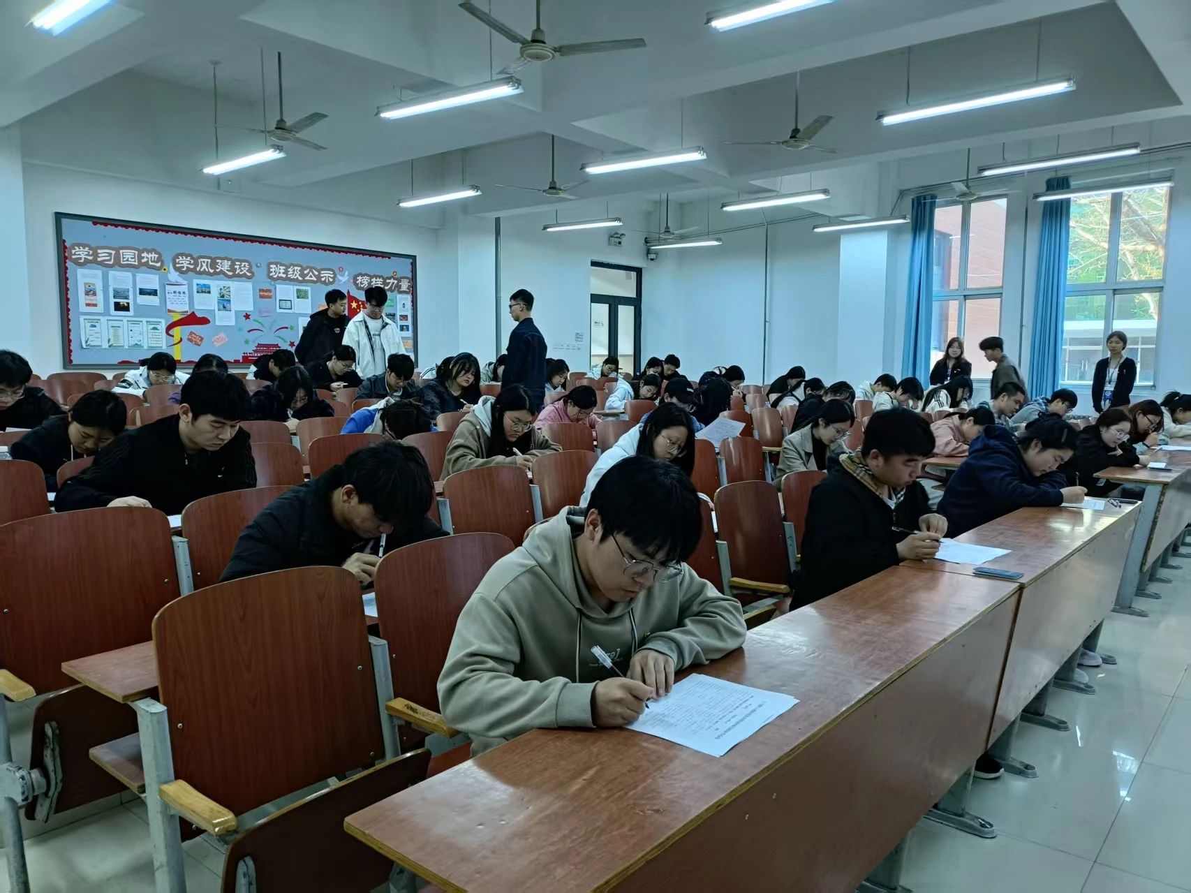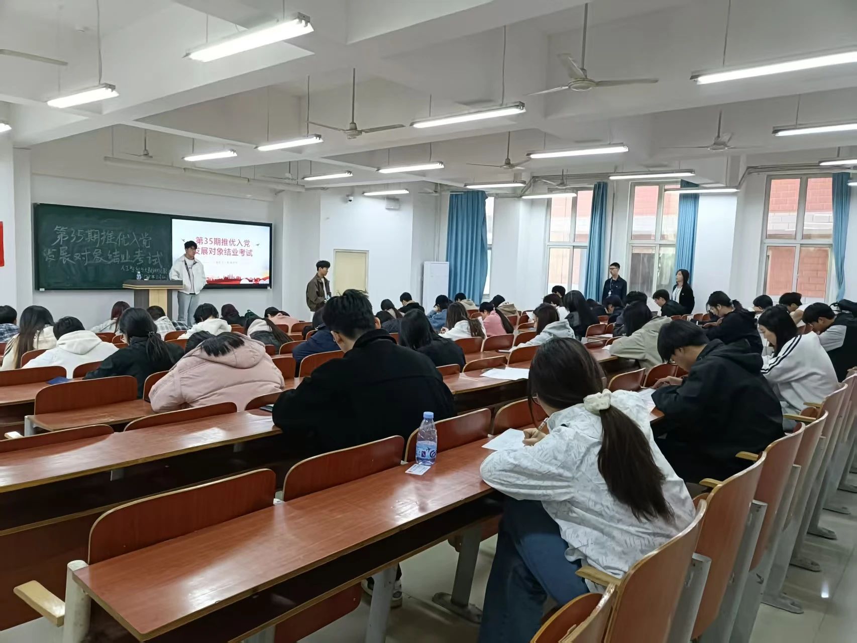 经过两天的集中培训和自主学习,我院于2025年3月30日17:00在主教1-2开展了第35期学院拟推荐发展对象院团课结业考核。本次考核全面涵盖了培训课程的各个方面,不仅涉及了团章中的核心内容,还对学员们在培训期间所学习到的各项知识进行了综合性的检验。在监考人员的积极组织中,考试顺利进行,考场秩序井然,纪律严格,为考生们提供了一个宁静而专注的考试环境。学生们在考试过程中全神贯注地作答每一个问题,他们的专注态度和认真精神充分展现了他们对党组织的热忱追求以及对学习任务的高度重视。