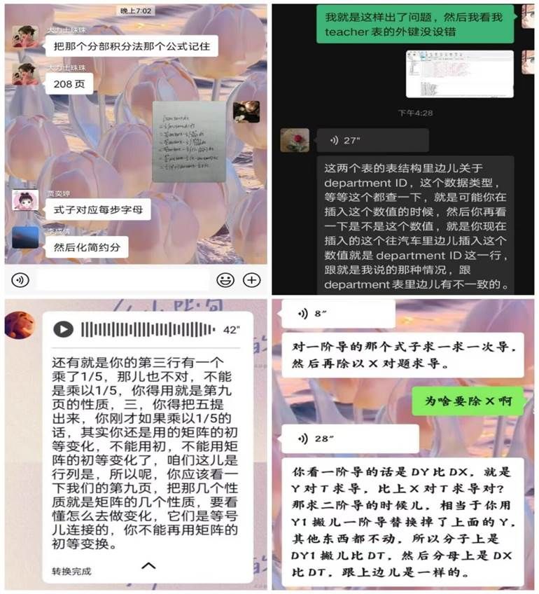 学生在家中询问老师有关高等数学的问题,老师通过语音交流的方式为学生们解决疑难,告知重点,每一步讲的都非常详细。学生们求知欲满满,积极提问,老师们课后耐心讲解,这使师生关系变得更加融洽。