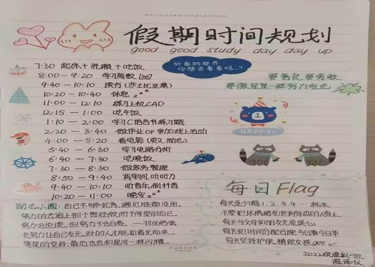 活动中,学生在家制作的作息时间表,不仅条理清晰,充分利用了时间,而且个性十足,简洁美观。学生每天按照时间表完成学习任务,作息均衡,时间充裕,为全体学生作出了表率。
