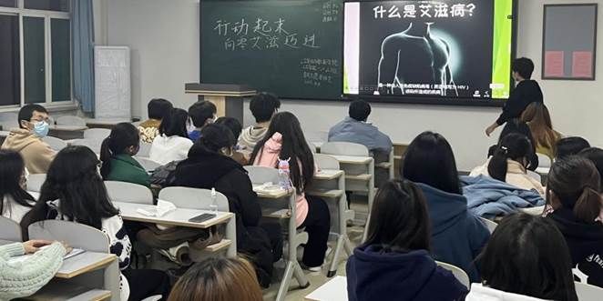 主讲员向学生讲述如何预防“艾滋病