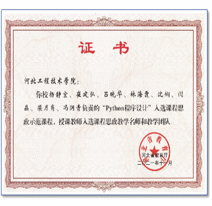 3.python程序设计”课程被认定为河北省课程思政示范课,教学团队获得河北省课程思政教学示范团队。